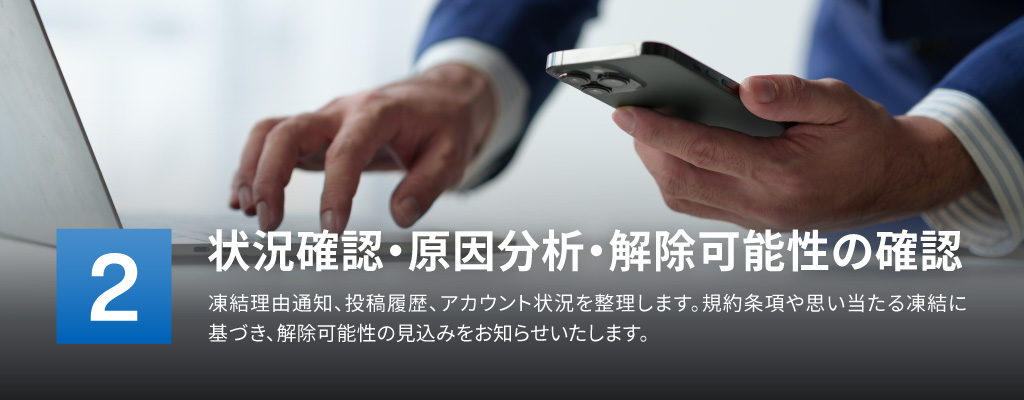 アカウント情報、凍結通知の内容、これまでの対応履歴などをご提供いただきます。